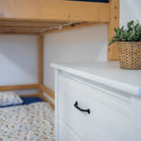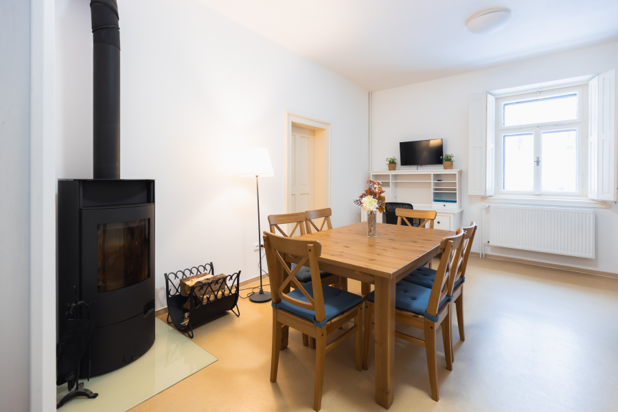 Severní apartmán se skládá z ložnice se čtyřmi lůžky a možností jedné přistýlky, z pokoje s kuchyňskou linkou, krbovými kamny a kuchyňským stolem a ze sociálního zařízení se sprchovým koutem.